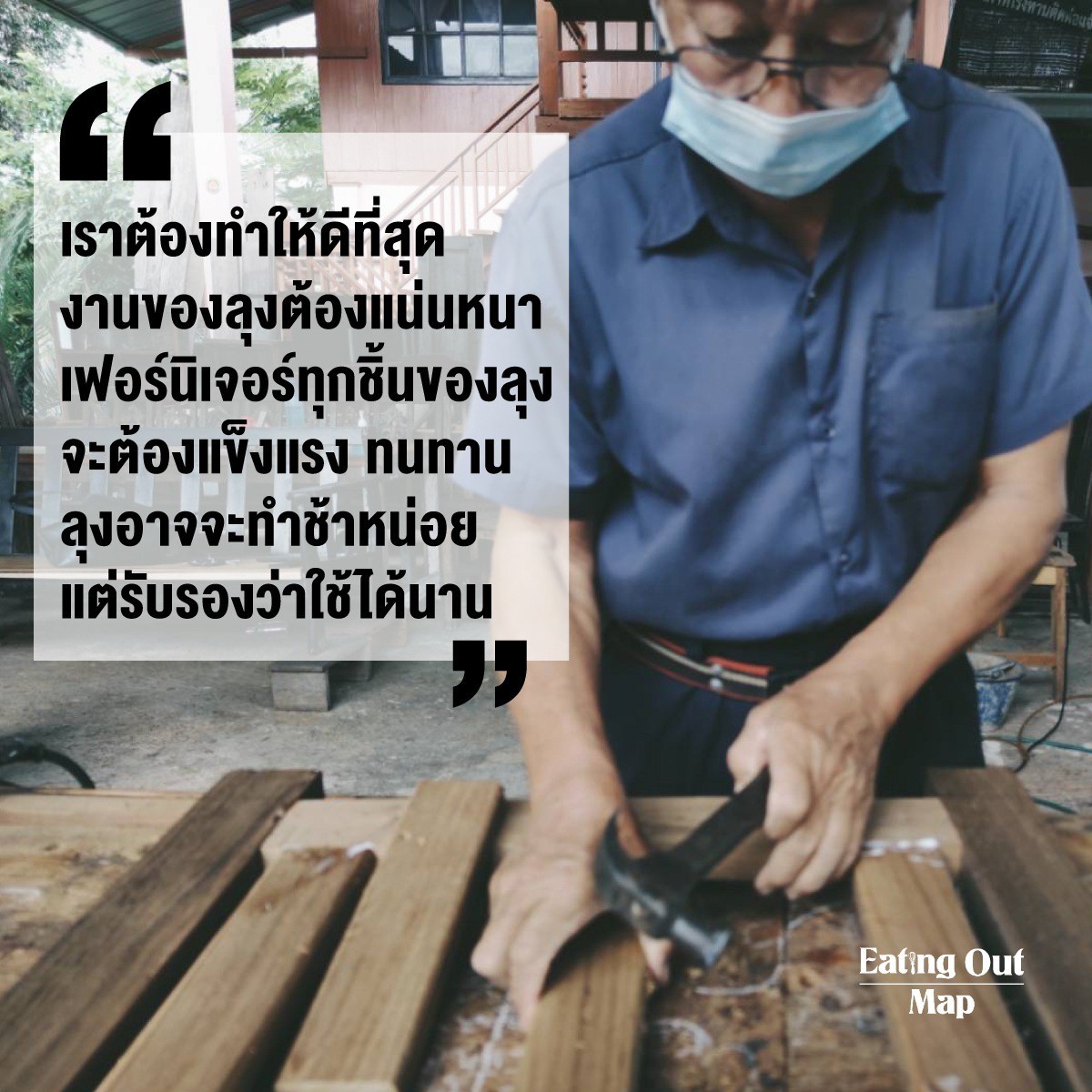 “เราต้องทำให้ดีที่สุด งานของลุงต้องแน่นหนา เฟอร์นิเจอร์ทุกชิ้นของลุงจะต้องแข็งแรง ทนทาน ลุงอาจจะทำช้าหน่อยแต่รับรองว่าใช้ได้นาน ถ้าเราทำดี เขาก็จะบอกต่อ เหมือนถ้าเราทำลาบอร่อย แม้ว่าร้านเราจะอยู่ในซอยเล็กๆ คนก็จะเข้ามากินลาบของเรา”