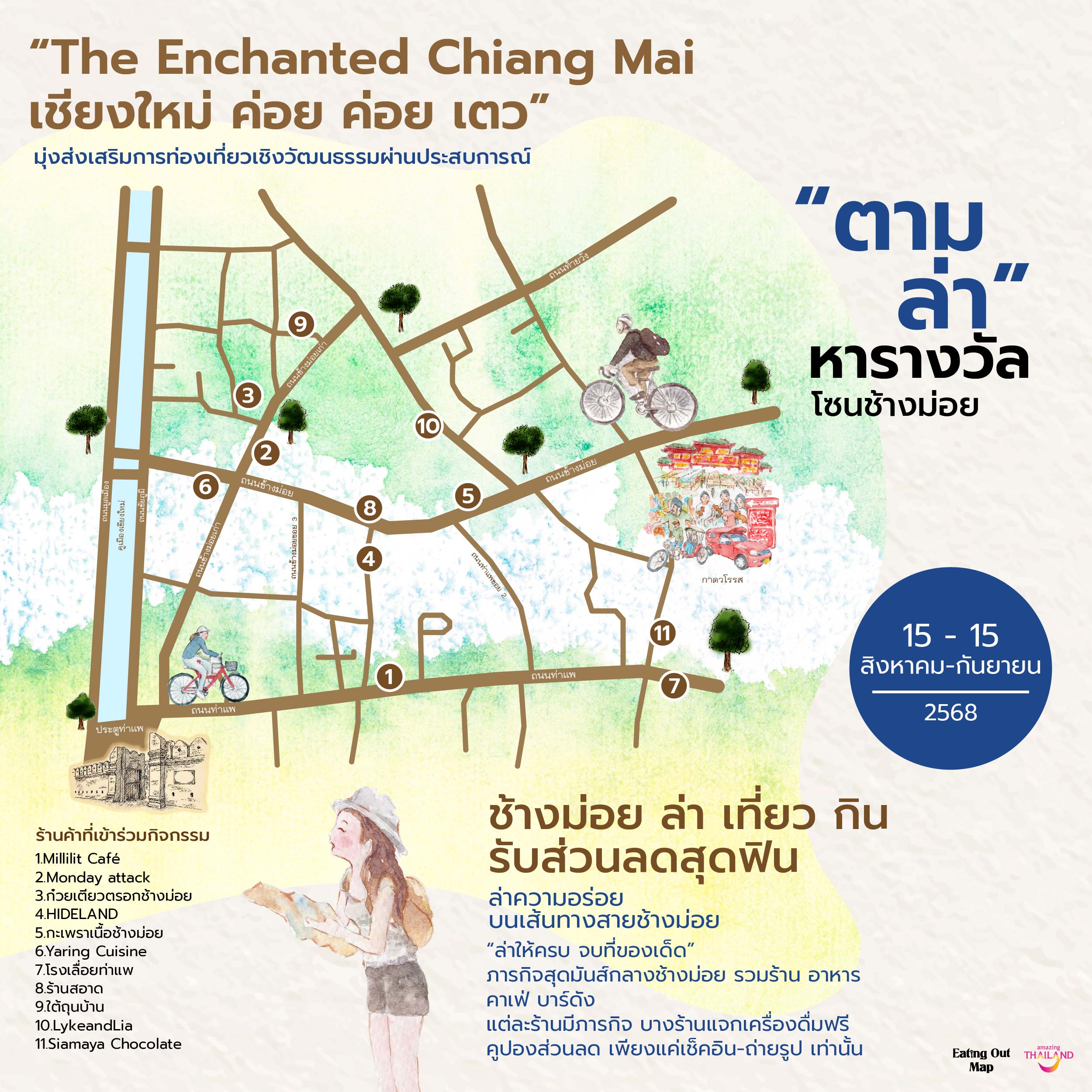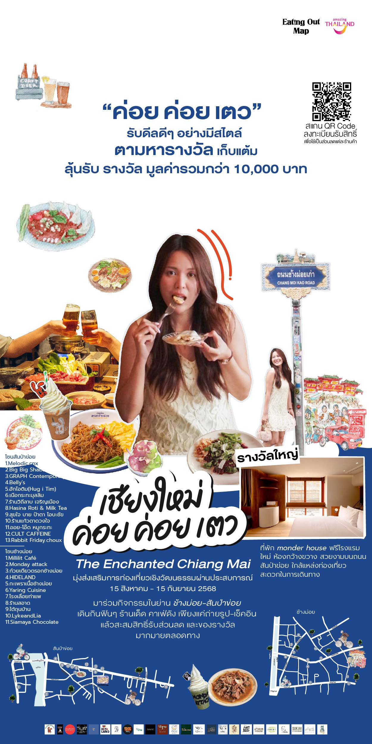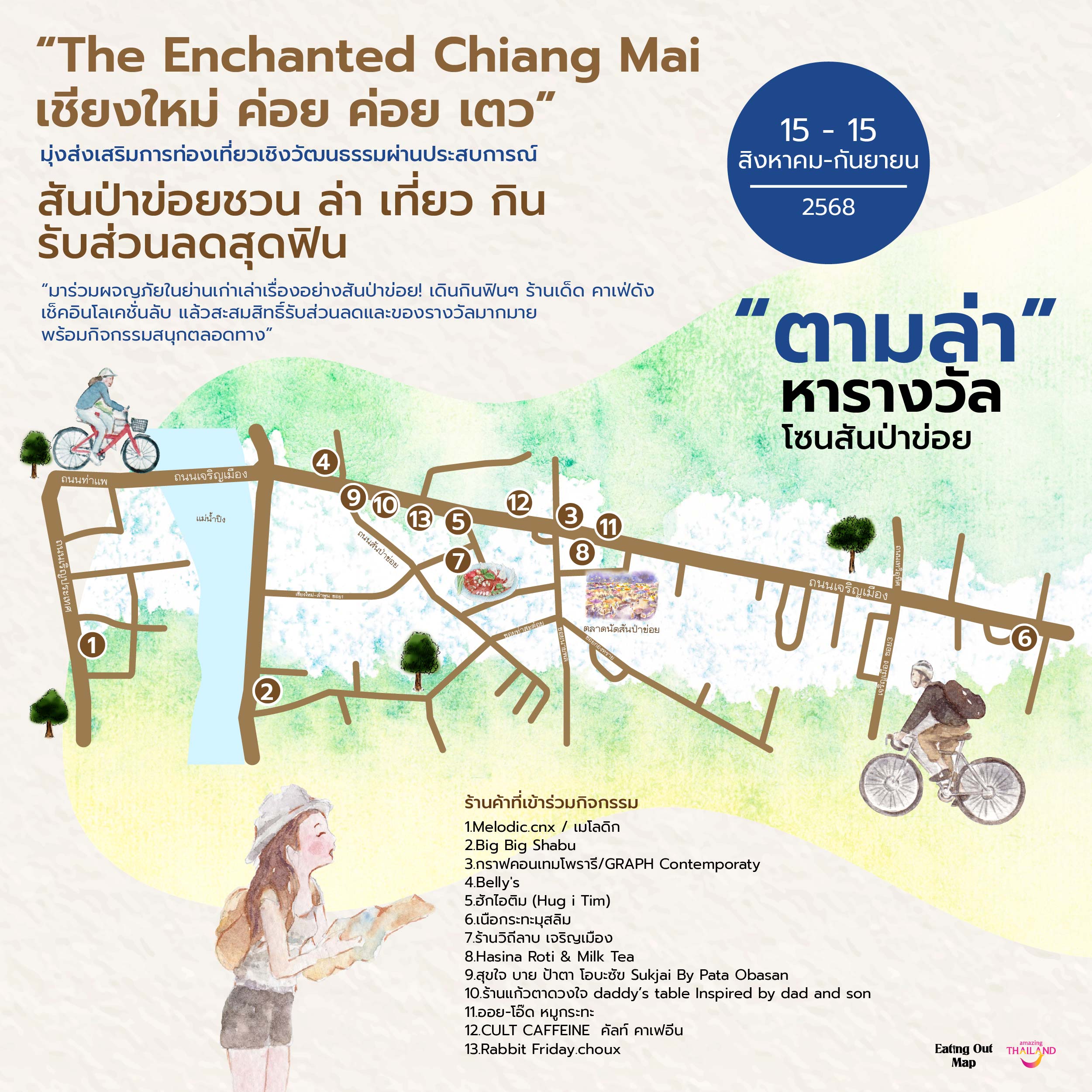 โครงการดีๆ ที่ ททท.เชียงใหม่ ร่วมกับ Eating Out Map – กินถึงถิ่น จะชวนทุกคนออกมาเดินเล่นอย่างละเมียดละไม พร้อมรับสิทธิพิเศษ โปรโมชั่นโดนๆ ดีลเด็ด จากร้านค้ากว่า 24 ร้านดังในย่านถนนช้างม่อย และสันป่าข่อย จังหวัดเชียงใหม่