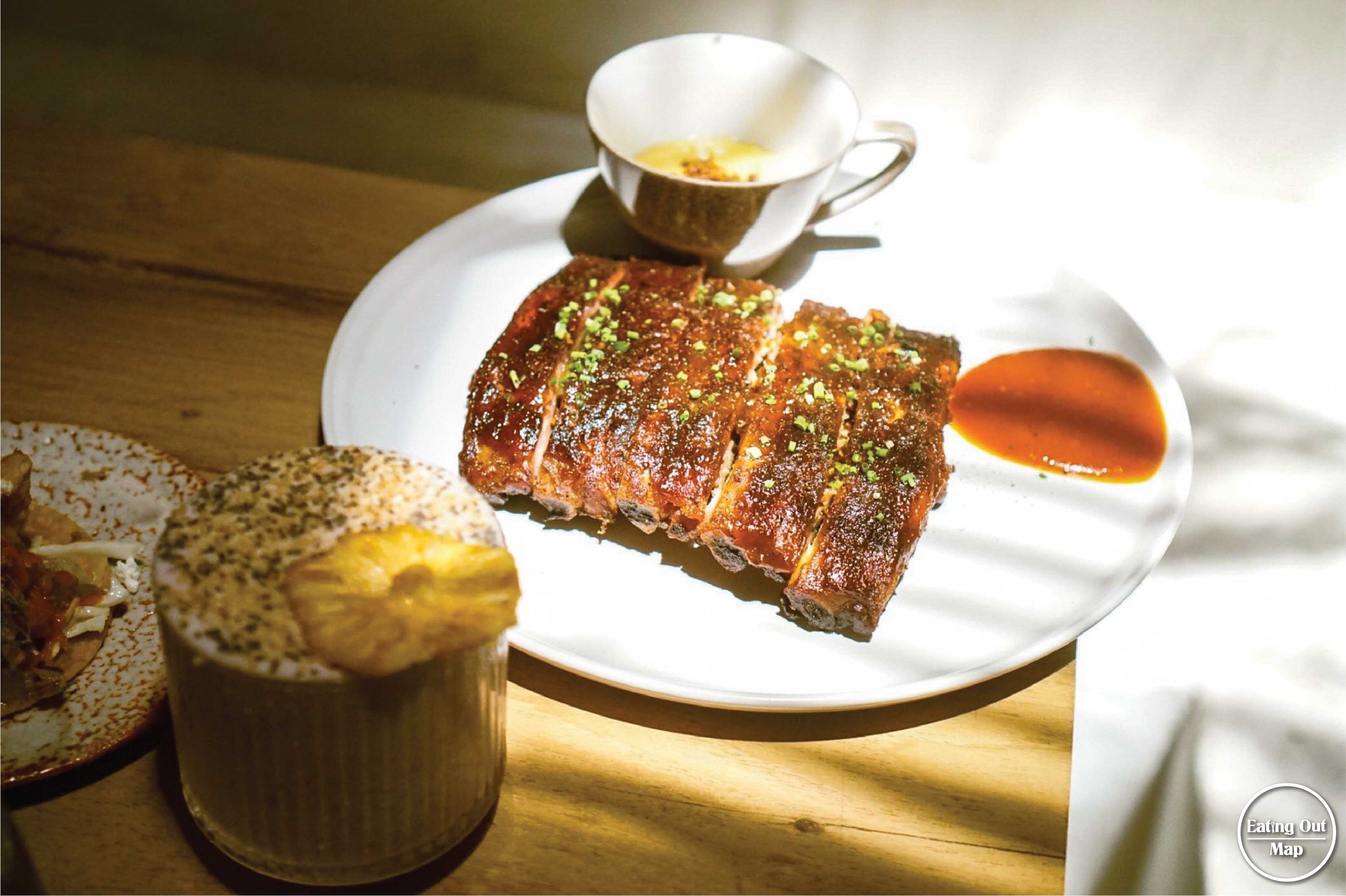BBQUE Smoked Pork Ribs เมนูประจำของทางร้าน ซี่โครงหมูที่ผ่านการรมควันประมาณ 4 - 6 ชั่วโมง ทานกับซอสสูตรของทางร้าน ตัดรสให้หอมนวลด้วย Corn Cream ที่ท็อปด้วยเบคอนกรอบ