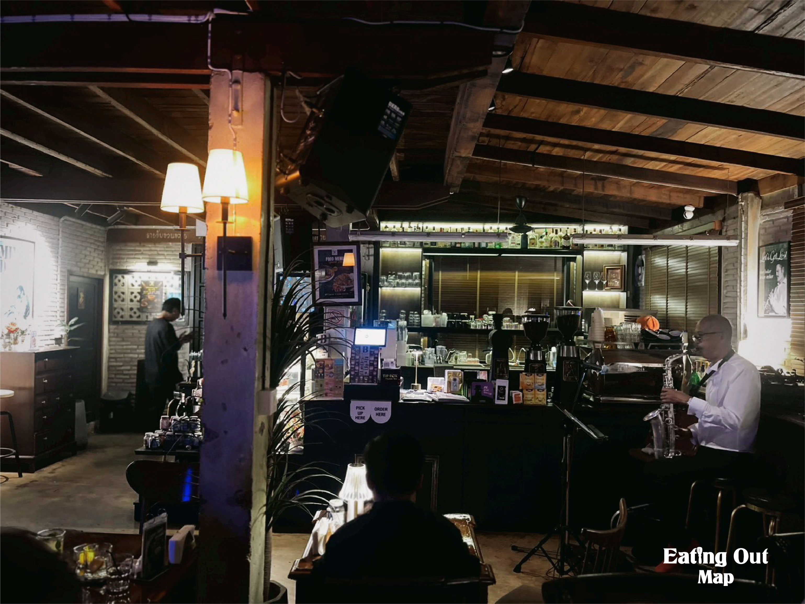 ในบางช่วงเวลาจะมี ดนตรีสดแจ๊สคลอเบา ๆ ที่ช่วยให้บรรยากาศค่ำของร้านอบอวลไปด้วยเสน่ห์ ????