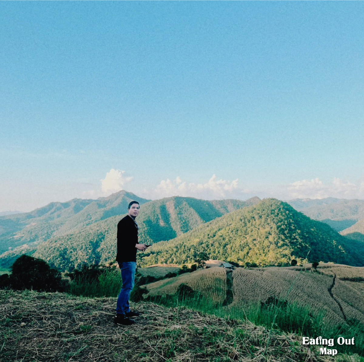นั่งจิบกาแฟไป มองออกไปเห็นวิวภูเขาและทุ่งนาแบบพาโนรามา