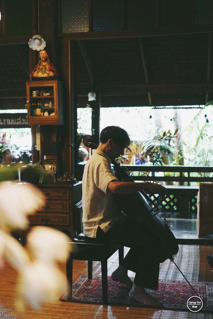 "เสื้อผ้าและเครื่องประดับเราจะทำแค่ไม่กี่ชิ้น แต่ก็มีคนเข้ามาเยี่ยมชมอยู่เรื่อยๆ ก็เลยเกิดเป็นร้านกาแฟขึ้นมา เราก็ทำให้เหมาะสมกับกำลังที่มีอยู่ เป็นดริปคอฟฟี่ สโลว์บาร์ ลูกค้าดูแลตัวเองเป็นส่วนใหญ่ ให้มีความรู้สึกว่าเวลามาที่นี่ เหมือนอยู่บ้านของตัวเอง ให้ลูกค้าใช้พื้นที่ในบ้านได้ เปิดพื้นที่ให้ทุกคนได้ชม เหมือนกับเป็นมิวเซียมเล็กๆ เป็นวิถีชีวิตที่เราไม่ได้ปรุงแต่งขึ้นมา เป็นธรรมชาติของตัวเราเอง ขนมกลีบลำดวน ชีสเค้กหน้าไหม้ ทีรามิสุ เราก็ทำเอง เครื่องดื่มของเราจะไม่เยอะ ส่วนใหญ่จะเน้นสุขภาพ อย่างคอมบูชะ ขิงน้ำผึ้งมะนาว หรือว่าชาอัสสัม เราก็ทำขึ้นมาจากสูตรของเรา"