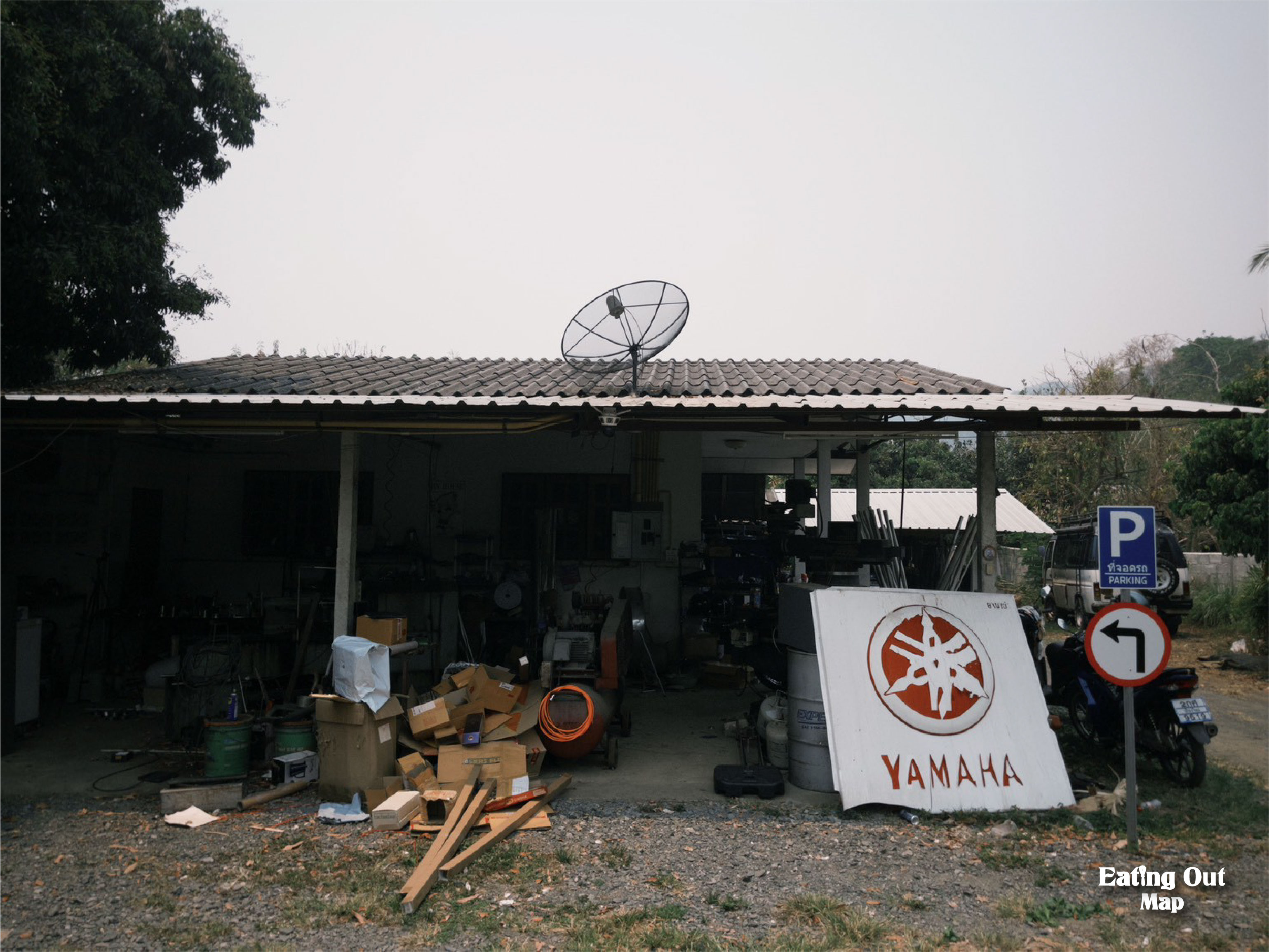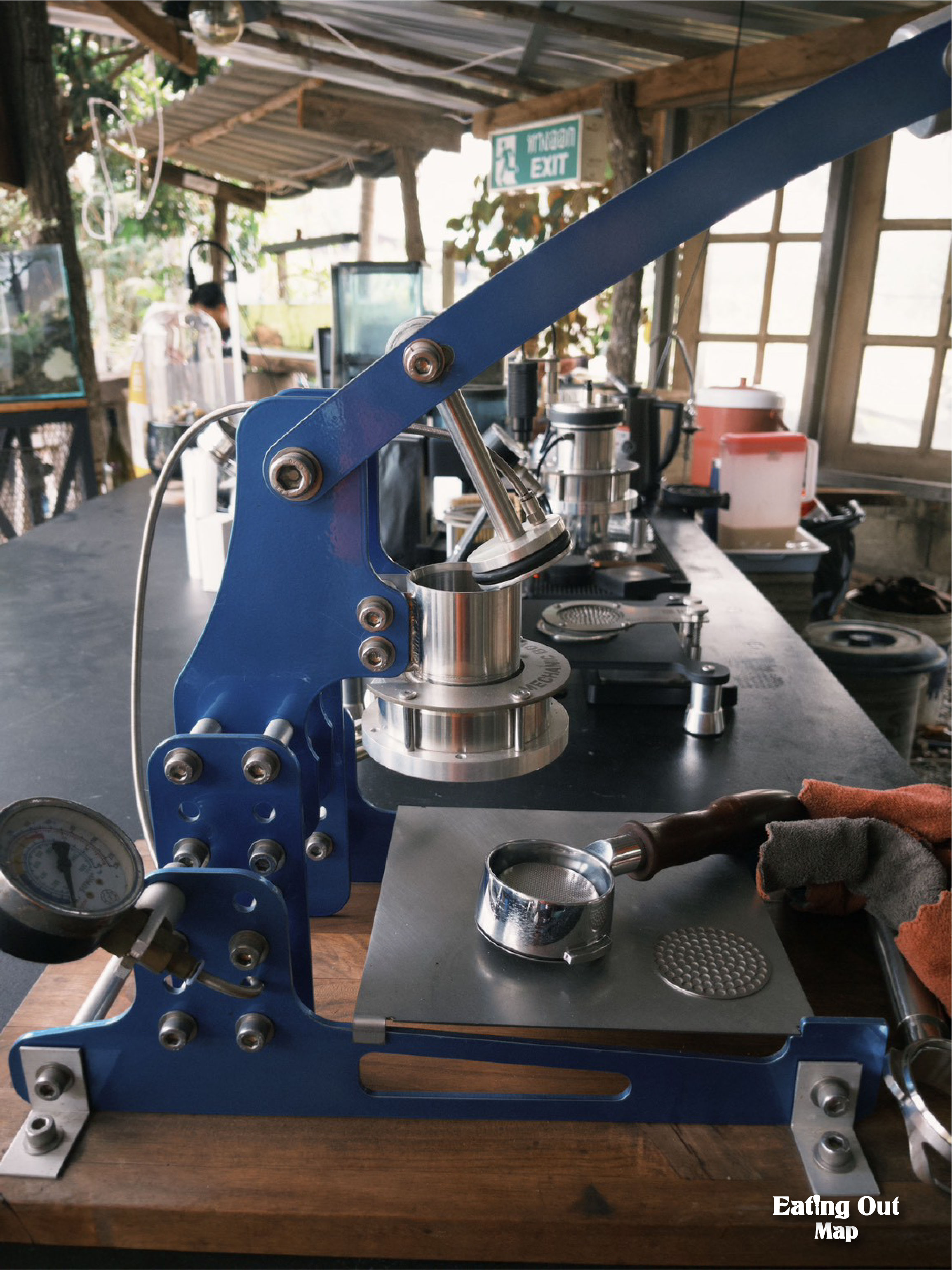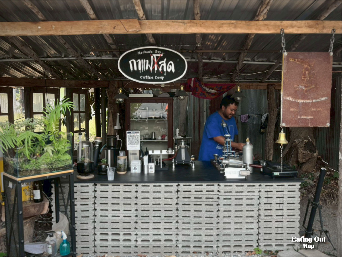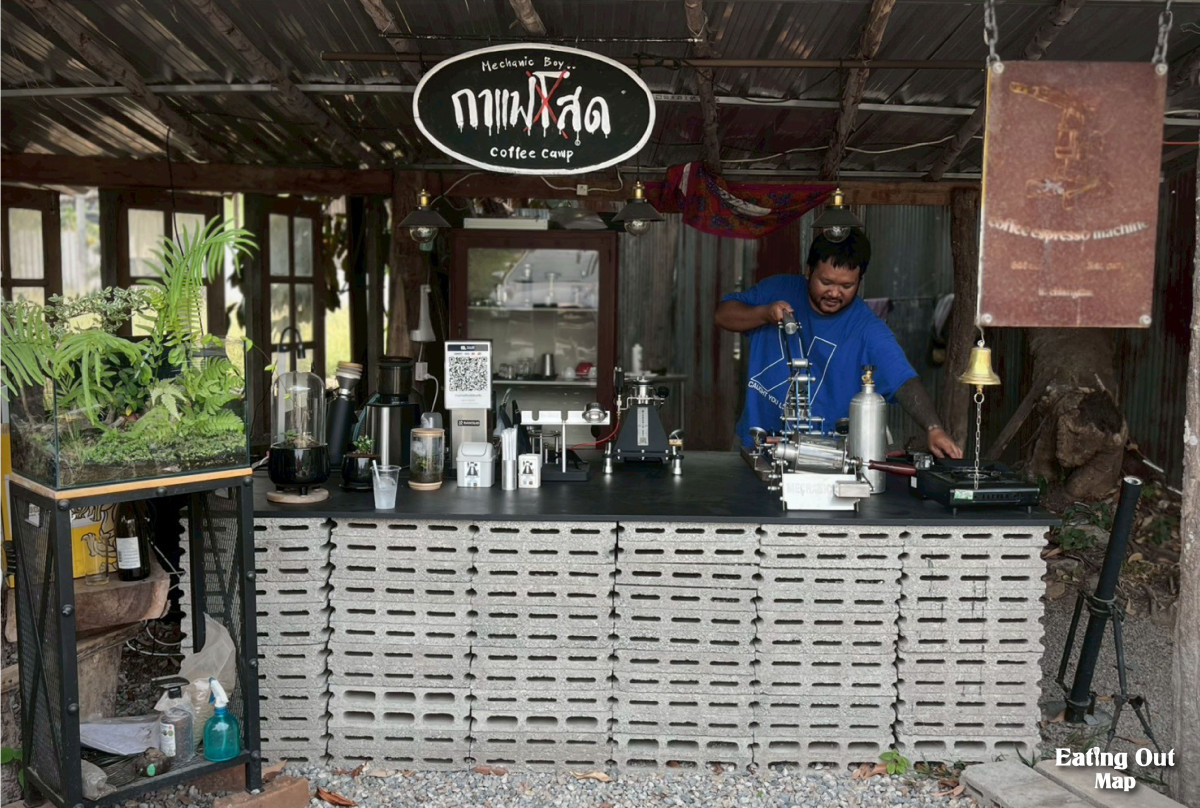 หน้าร้านคือก๋วยเตี๋ยวเรือ หลังร้านคือโรงกลึงเหล็กดัง กริ๊ก กริ๊ก กริ๊ก ข้างร้านคือกาแฟหอมฟุ้งจากเครื่องชงแบบกดที่ช่างทำเองกับมือ