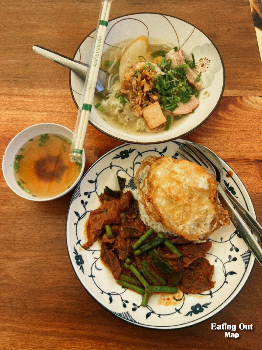 เมนูไฮไลต์คือ ก๋วยเตี๋ยวภูเก็ต ชามเดียวรวมซีฟู้ดหลายอย่างไว้ด้วยกัน ทั้งสด ทั้งหวานน้ำทะเล รสซุปมีชั้นเชิงแบบคนผ่านครัวจริง ไม่ใช่สูตรลัดตามกระแส กินแล้วให้อารมณ์เหมือนยกทะเลอันดามันมาไว้ข้างวัดล้านนา